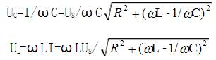 (4)、電感上的電壓UL與電容上的電壓UC數值相等,相位相差180°,UL=UC=QUS。