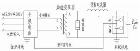 我們已知,在回路頻率f=1/2π√LC時(shí),回路產(chǎn)生諧振,此時(shí)試品上的電壓是勵磁變高壓端輸出電壓的Q倍。Q為系統品質(zhì)因素,即電壓諧振倍數,一般為幾十到一百以上。先通過(guò)調節變頻電源的輸出頻率使回路發(fā)生串聯(lián)諧振,再在回路諧振的條件下調節變頻電源輸出電壓使試品電壓達到試驗值。由于回路的諧振,變頻電源較小的輸出電壓就可在試品CX上產(chǎn)生較高的試驗電壓。