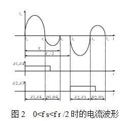 全橋串聯(lián)諧振充電電源電路如圖1所示。全控型開(kāi)關(guān)Z1~Z4及續流二極管D1~D4組成的逆變橋與LC諧振支路構成全橋串聯(lián)諧振變換器。inV為直流輸入電壓,負載電容通過(guò)D5~D8構成的整流橋與LC諧振支路相串聯(lián),T為升壓變壓器。 串聯(lián)諧振變換器按開(kāi)關(guān)頻率fs與諧振頻率fr的大小關(guān)系有三種工作方式:(1)0<f s<f r /2;(2)f r/ 2<f s<f r;(3)f s>f r。 其中,方式(1)在開(kāi)關(guān)器件開(kāi)通和關(guān)斷時(shí)損耗都最小,被選作電容器恒流充電電源的工作方式。其工作時(shí),一個(gè)開(kāi)關(guān)周期的諧振電流波形示意圖見(jiàn)圖2。