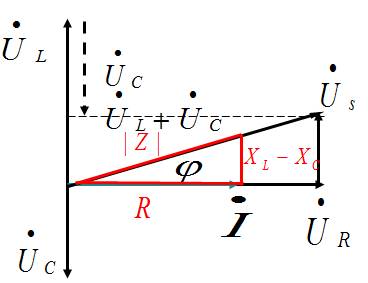 電感上的電壓UL與電容上的電壓UC相位相差180°。阻抗是電阻與電抗在向量上的和。