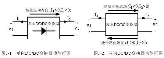 我們所熟悉的DC/DC變換器多數是單向工作的,如圖1-1所示,這是由于在通常的單向DC/DC變換器(Unidirectional DC/DC Converter,UDC)中,主功率傳輸通路上一般都有二極管這個(gè)環(huán)節,故能量經(jīng)變換器流動(dòng)的方向只能是單方向的,即在圖中能量只能從V1流動(dòng)到V2,而不能反向流動(dòng)。然而對于有些需要能量雙向流動(dòng)的場(chǎng)合(V1和V2可以是直流有源負載或直流電壓源,它們的電壓極性保持不變,能量在不同時(shí)刻可以從V1傳輸到V2,也可以從V2傳輸到V1),如果仍使用單向DC/DC變換器,則需要將兩個(gè)單向DC/ DC變換器反向并聯(lián),一臺單向DC/DC變換器被用來(lái)控制能量從V1到V2的流動(dòng),另一臺反并聯(lián)的單向DC/DC變換器被用來(lái)控制能量從V2到V1的反向流動(dòng)。這樣一來(lái),由于使用了兩臺DC/DC變換器,總體電路變得復雜化,變換裝置的體積較大,利用率和性?xún)r(jià)比較低,而且由正向工作到反向工作的切換時(shí)間比較長(cháng)。通過(guò)研究分析,可以通過(guò)合理的拓撲結構和控制方法使用一 2 個(gè)變換器來(lái)完成這兩個(gè)獨立的單向變換器的功能,即采用雙向DC/DC變換器。