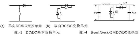 從電路拓撲上講,單向DC/DC變換器可簡(jiǎn)化為含有單向DC/DC基本變換單元的基本原理結構,該基本變換單元由一個(gè)有源開(kāi)關(guān)器件和一個(gè)二極管構成,如圖1-3(a)所示的。而常規的雙向DC/DC變換器,可簡(jiǎn)化為含有雙向DC/DC基本變換單元的基本原理結構,該基本變換單元由兩個(gè)各自并有反并聯(lián)二極管的有源開(kāi)關(guān)器件構成,如圖1-3(b)所示,這些反并二極管也可以是有源開(kāi)關(guān)器件內的寄生二極管。圖1-4為基本的Boost/Buck雙向DC/DC變換器,該變換器有兩種基本的工作方式:S1采用PWM工作方式,S2采用與S1互補的方式工作,變換器實(shí)際上為一個(gè)Boost變換器,能量從V1傳輸到V2;S2采用PWM工作方式,S1采用與S2互補的方式工作,此時(shí)變換器實(shí)際上為一個(gè)Buck變換器,能量從V2傳輸到V1。