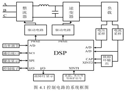 為了克服以上缺點(diǎn)我們采用數字處理技術(shù),將傳統采用模擬控制方式的模擬電源升級為數字電源(DPS--Digital Power Supply)。數字電源控制電路的核心器件是數字信號處理器(DSP)。目前數字信號處理(DSP)技術(shù)逐漸成熟,因此本次中頻電源的設計以 TMS320F2812 型 DSP 為控制電路的核心。控制電路主要實(shí)現的功能有:整流軟啟動(dòng)、整流及逆變觸發(fā)及驅動(dòng)、數字鎖相運算、電壓電流采集、功率的運算調節、顯示工作狀態(tài)、與上位機通信、輸出過(guò)壓過(guò)流與水溫水壓故障等的保護等等。圖 4.1 為控制電路的系統框圖。