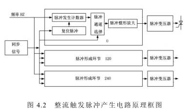 (3) 對整流設計專(zhuān)門(mén)的驅動(dòng)電路,DSP 只給驅動(dòng)電路發(fā)送移相角度及封鎖等信號。驅動(dòng)電路能自動(dòng)完成同步信號采集,移相角度控制及驅動(dòng)脈沖的生成等。通過(guò)綜合比較,最終本次設計選用第三種方案整流對整流進(jìn)行控制。圖4.2 為本次設計的整流觸發(fā)脈沖產(chǎn)生電路原理框圖。此脈沖產(chǎn)生電路主要由同步信號采樣電路、脈沖形成電路和脈沖放大電路三部分組成。