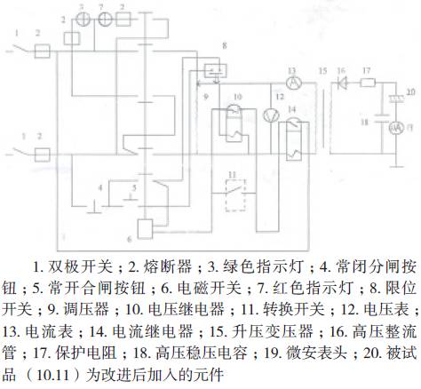 根據這種情況我將我們現在使用的直流高壓發(fā)生器進(jìn)行了改進(jìn),在直流高壓發(fā)生器的控制電路中加入一限壓電壓繼電器,通過(guò)控制進(jìn)入到變壓器的輸入而達到控制輸出電壓的目的。電壓繼電器是通過(guò)插件與試驗器的控制箱相連,在使用時(shí)將繼電器插入控制箱,通過(guò)轉換開(kāi)關(guān)將繼電器與控制線(xiàn)路聯(lián)系在一起,試驗完畢后,將繼電器拔出,通過(guò)轉換開(kāi)關(guān)將電路恢復到原來(lái)狀態(tài)。
