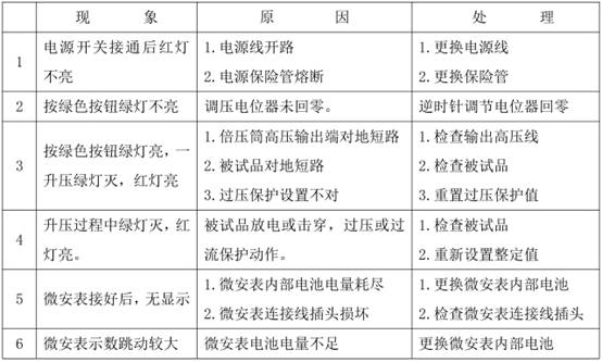 第三步:順時(shí)針?lè )较蚱骄徴{節電壓調節電位器,輸出端即從零開(kāi)始升壓,主機電壓表顯示的值為所升電壓值,緩慢升壓至接近過(guò)壓保護整定值時(shí)后,記錄電壓表讀數,并驗證記錄值是否為電壓整定值的 1.1 倍,并檢查主機及高壓輸出線(xiàn)有無(wú)異常現象及聲響。