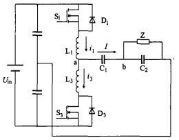 下面討論圖 2 所示半橋串聯(lián)諧振電容分壓輸出逆變電路的工作原理 。其中 i1 為流過(guò) L1 的電流 , i3 為流過(guò) L 3 的電流 ,流過(guò)電容和負載的總電流I是兩個(gè)電流i1, i3的矢量差 ,電容兩端電壓Uc滯后電I90 ° 。