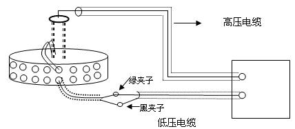 (3)反接線(xiàn)時(shí):將高壓電纜插頭插入后門(mén)HV插座中,將高壓電纜接地端頭接入接地柱中,將另一端的紅色鱷魚(yú)夾夾到被測試品的高端引線(xiàn)上,黑色夾子懸空或接屏蔽裝置。Cx插座不用。