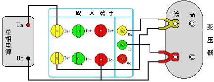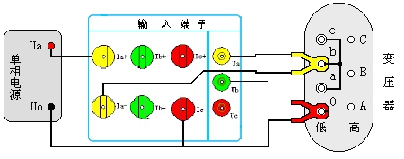 用一單相電源作為測試電源,火線(xiàn)接到測試儀的A相電流端子正端,黃鉗子粗線(xiàn)接到A相電流端子的負端,細線(xiàn)接到A相電壓端子Ua,紅鉗子粗線(xiàn)直接接到測試電源的零線(xiàn),細線(xiàn)接到B相電壓端子Ub,兩把鉗子分別夾到低壓側兩個(gè)接線(xiàn)柱上。高壓側用專(zhuān)用短接線(xiàn)短接,注意一定要短接良好,否則會(huì )影響測試數據。