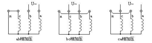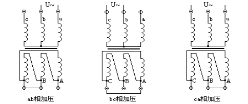 依次在任兩相之間加壓,同時(shí)非加壓側的三相出線(xiàn)端人工短連接。