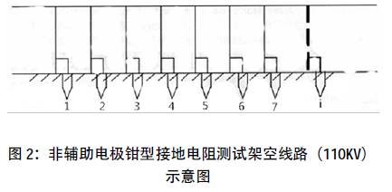 鉗型接地電阻測試儀屬于一種不用輔助電極形式的測試儀,具有使用方便、簡(jiǎn)單,且不容易受外界環(huán)境影響的特點(diǎn),同時(shí)鉗型接地電阻測試儀在測量數據時(shí)具有一定的穩定性和準確性,儀器設備也較成熟,具有一定可靠性。但是鉗型接地電阻測試儀也具有一定的缺陷,即儀器的使用范圍受到限制,在很多情況下都不能正常使用。下圖為非輔助電極鉗型接地電阻測試架空線(xiàn)路(110KV)示意圖2。