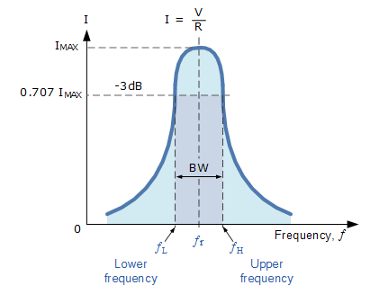 這些-3dB點(diǎn)給我們一個(gè)電流值,該值是它的最大諧振值的70.7%,其定義為:0.5(I 2 R)=(0.707×1)2 - [R 。然后對應于較低頻率以一半的功率的點(diǎn)被稱(chēng)為“較低的截止頻率”,標記大號與對應于最高頻率的點(diǎn),同時(shí)半功率被稱(chēng)為“上限截止頻率”,標記為^ h。這兩個(gè)點(diǎn),即,之間的距離(-大號)被稱(chēng)為帶寬,(BW),并且是在其在最大功率和電流的至少一半,如圖設置的頻率范圍。