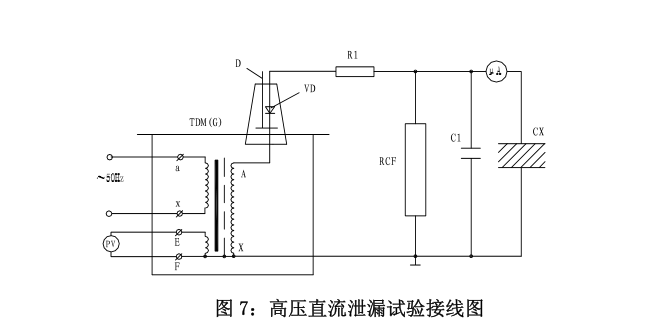 試驗變壓器在做被試品的直流耐壓或泄漏試驗時(shí)接線(xiàn)原圖如圖7。