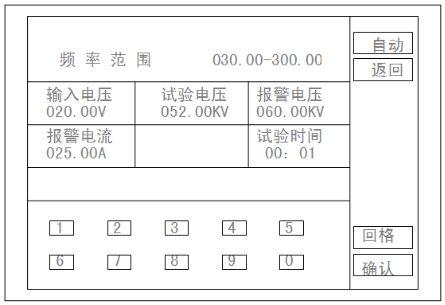l 報警電壓:設置試驗電壓的極限值,電壓超過(guò)時(shí)自動(dòng)終止試驗。