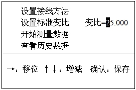 屏幕上顯示的變比值是本次測量需要的實(shí)際標準變比值,按“↑”“↓”鍵可以修改此值。每次修改的幅度=設置的標準變比×調壓比。測量完成后,