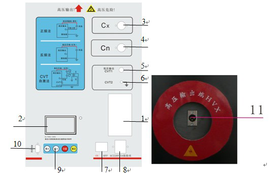 11、HV插座:高壓引出端子,由高壓電纜連接,接試品高壓端。輸出10kV高壓。