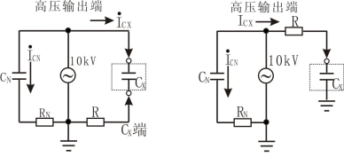 按被測試品是否接地分兩種測量方式,即正接線(xiàn)測量方式和反接線(xiàn)測量方式。兩種測量方式的原理如圖3所示: