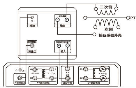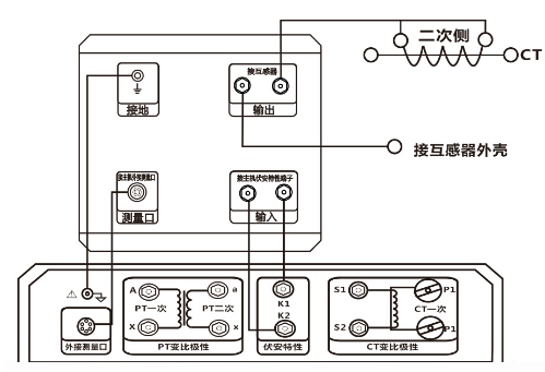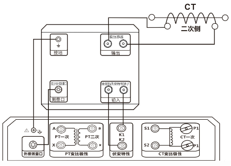 交流耐壓升壓器接線(xiàn):升壓器接線(xiàn)方式如圖五所示,試驗方法與伏安主機單機方式相同。