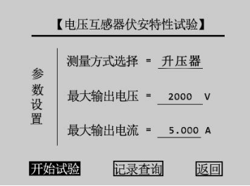 1.伏安特性升壓器參數設置:在電壓互感器伏安特性試驗界面,如圖六所示。測量方式選擇:升壓器,最大輸出電壓和最大輸出電流根據被試品設定。