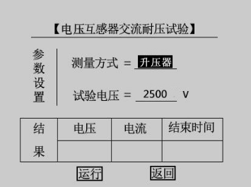 2.交流耐壓升壓器參數設置:在電壓互感器交流耐壓試驗界面,如圖八所示。測量方式選擇:升壓器,試驗電壓根據試驗需求設定。設置原則:當交流耐壓試驗電壓大于1000V時(shí),測量方式選擇升壓器,此時(shí)儀器默認電壓為1500V。