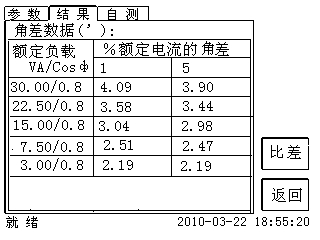 選擇相位差表將顯示不同額定電流百分比和不同負荷值情況下被測CT的相位差表如圖2.21: